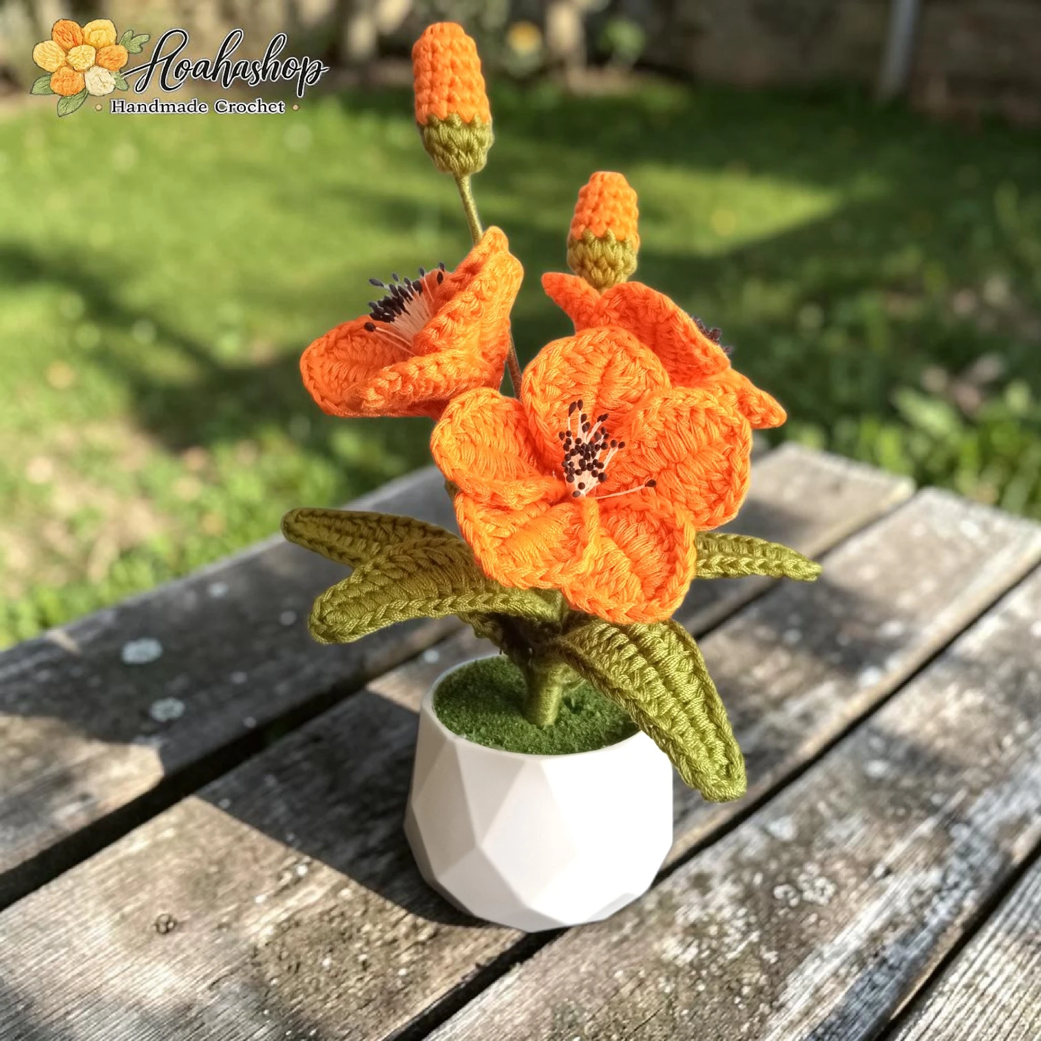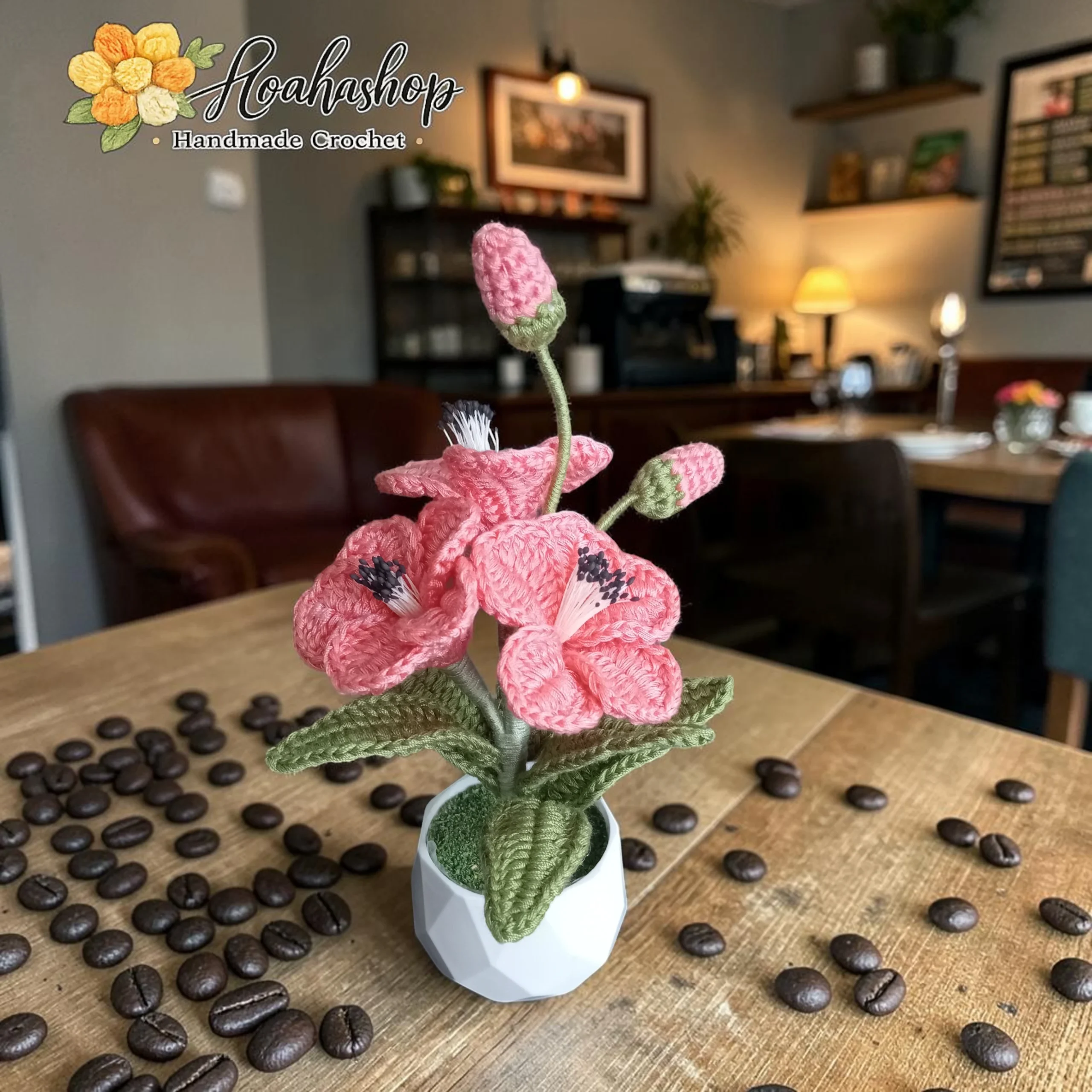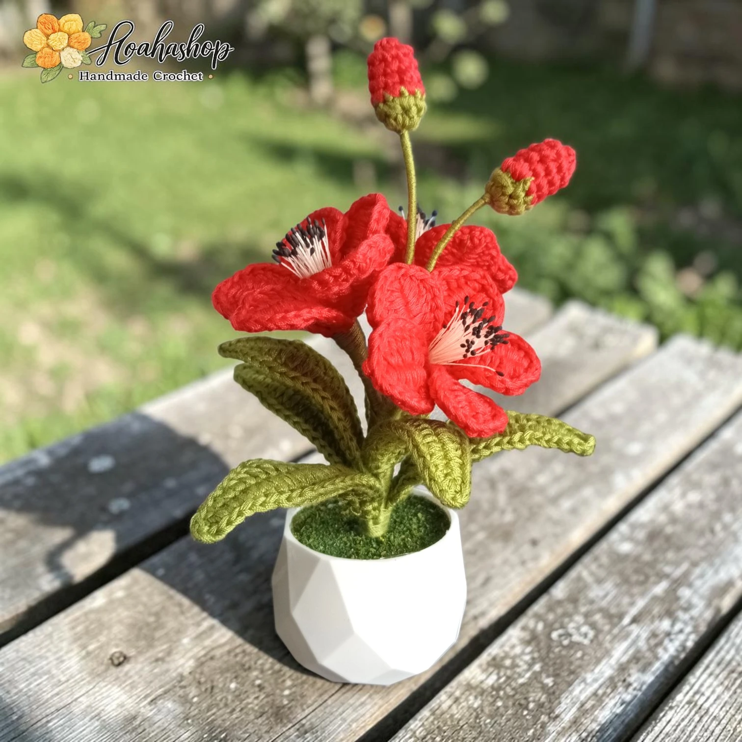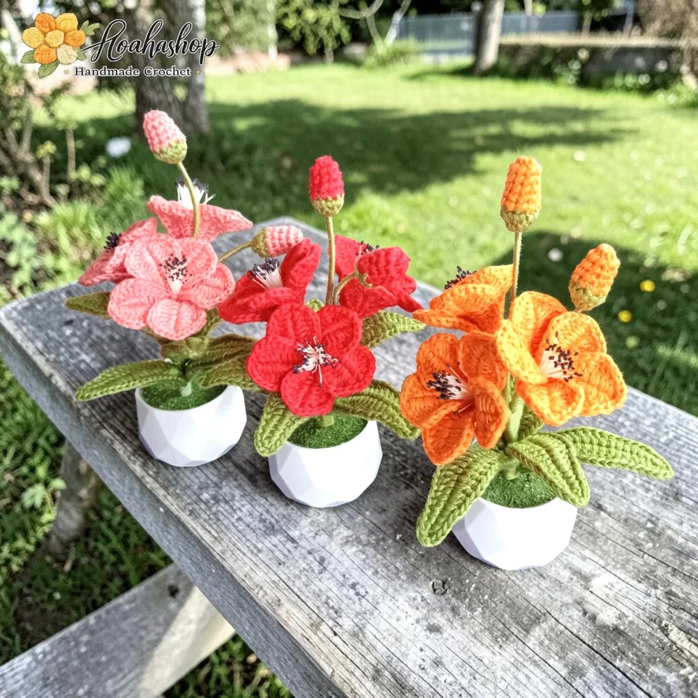 Mỗi chậu hoa được tạo nên bằng những mũi móc tỉ mỉ, kết hợp sắc đỏ – cam nổi bật, mang đến cảm giác tươi sáng và đầy năng lượng. Kích thước nhỏ gọn nhưng nổi bật, lý tưởng để trang trí góc bàn mà không chiếm diện tích.